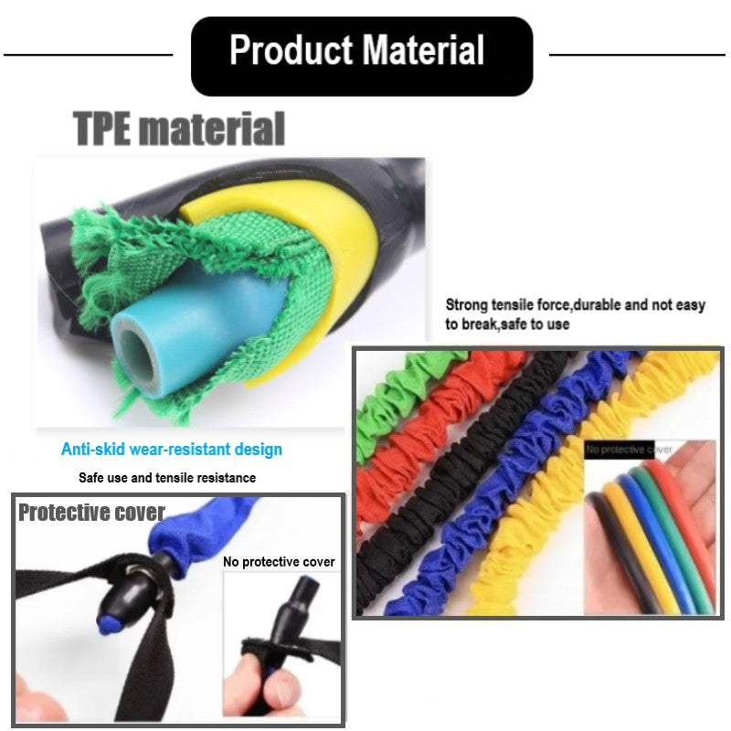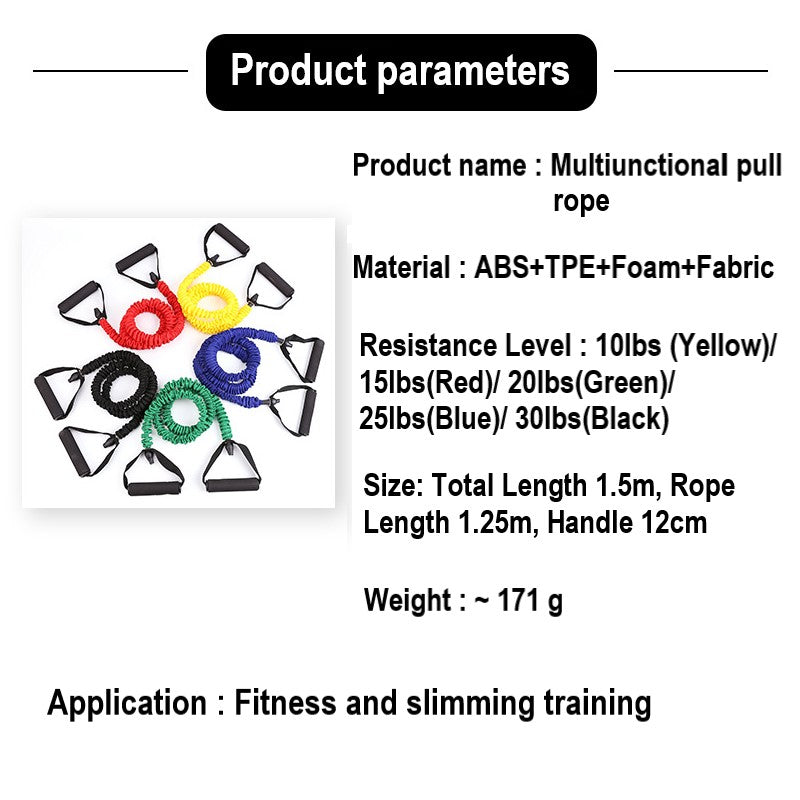 - Resistance Level : Yellow (10lbs), Red (15lbs), Green (20lbs), Blue (25lbs), Black (30lbs)
